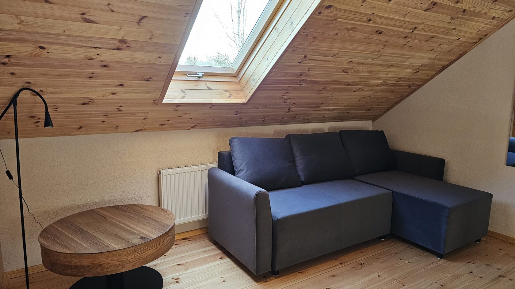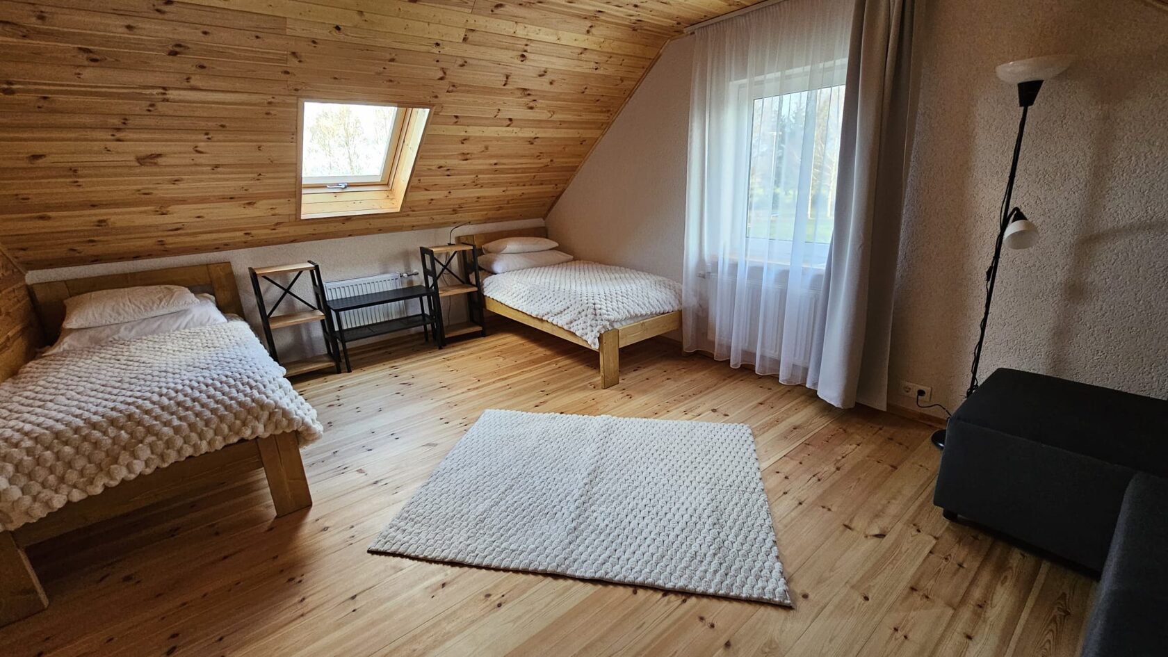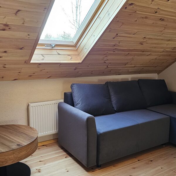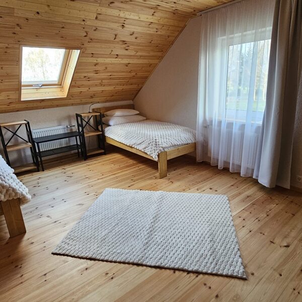 Otrajā stāvā ir 2 guļamistabas. Viena guļamistaba ar 2 vienvietīgām gultām (0.9x2m) un izlaižamu stūra dīvānu. Otra guļamistaba ir ar 1 divguļamu gultu (1.80 x2 m)