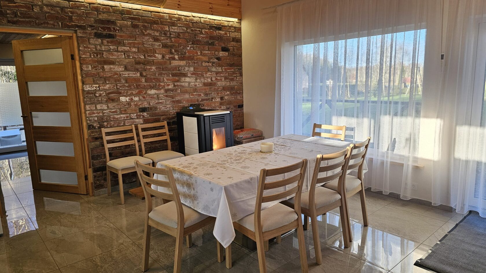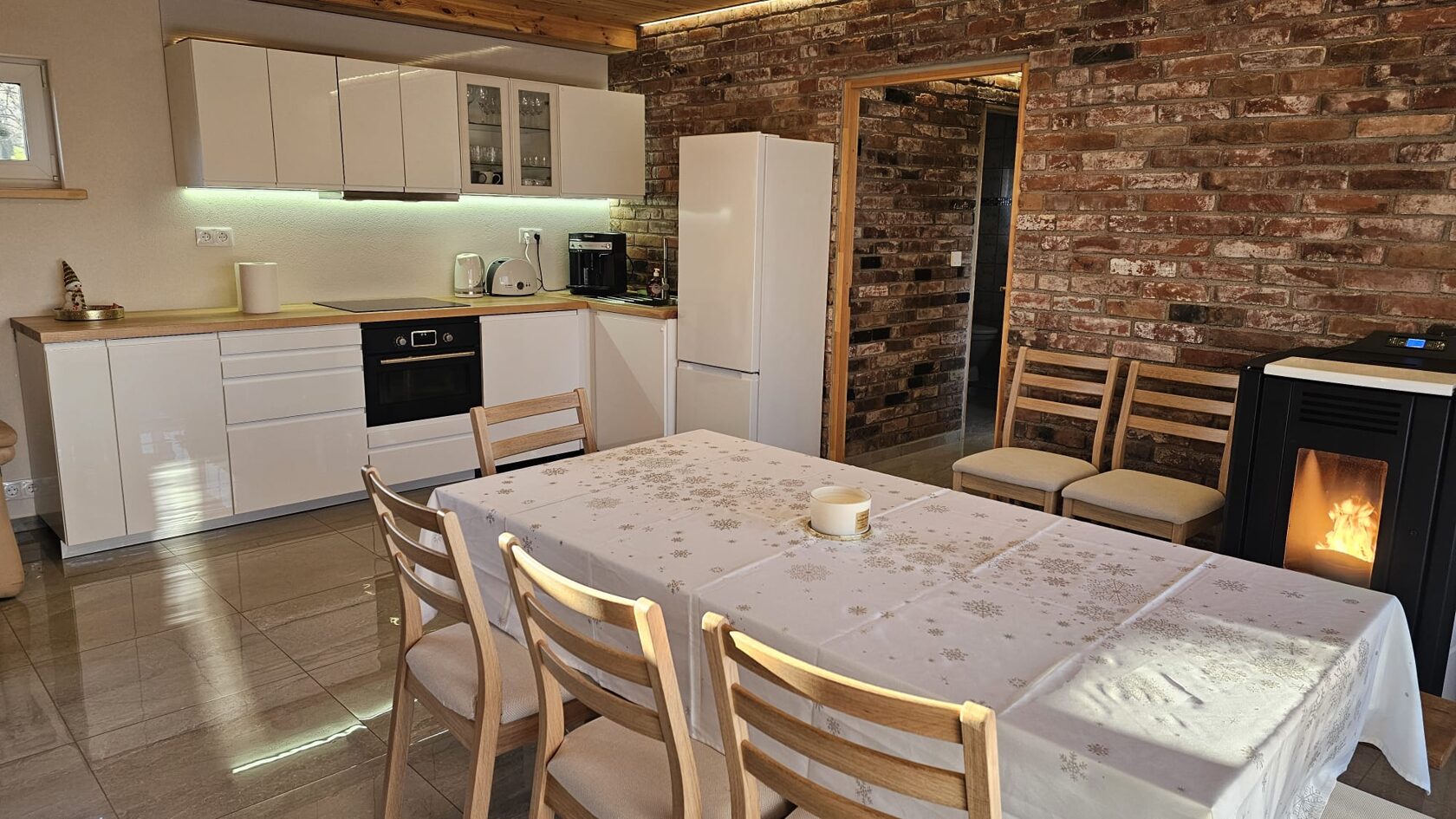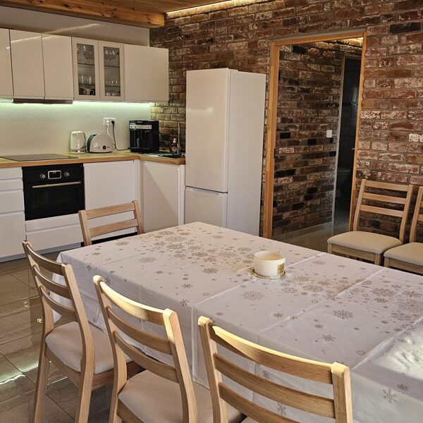 Namiņa pirmajā stāvā ir guļamistaba un labiekārtota virtuve. Guļamistabā ir 1 divvietīga gulta (1.80 x 2 m) un izlaižams vienvietīgs dīvāns. Virtuvē ir indukcijas plīts, ledusskapis, elektriskā tējkanna, mikroviļņu krāsns/cepeškrāsns, trauku mazgājamā mašīna, kā arī viss nepieciešamais ēst gatavošanai- pannas, katli, trauki. Viesu labsajūtai piedāvājam kafijas automātu ar uzpildītām kafijas pupiņām.