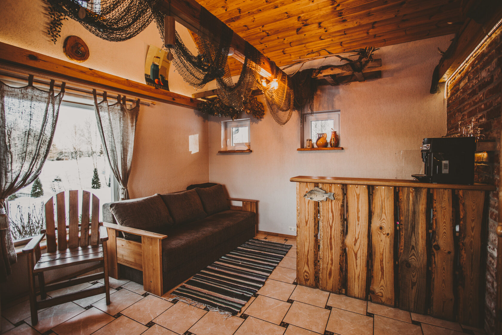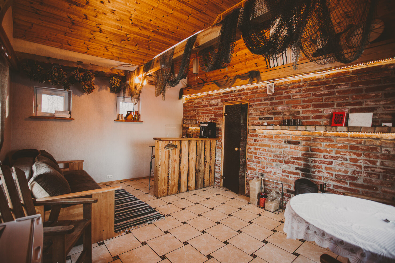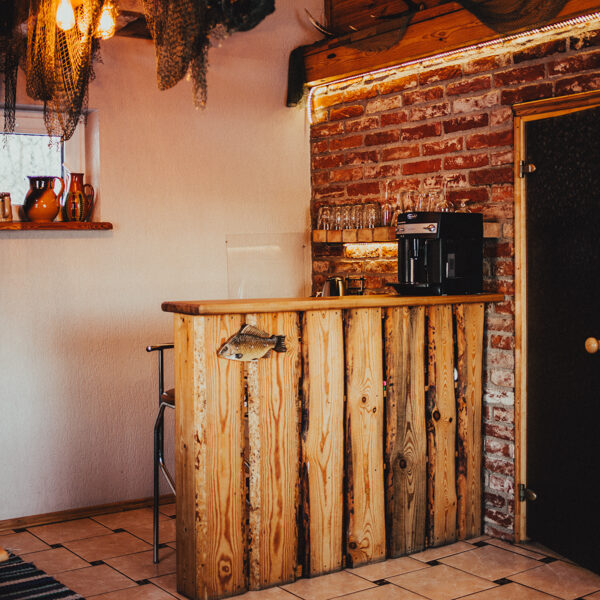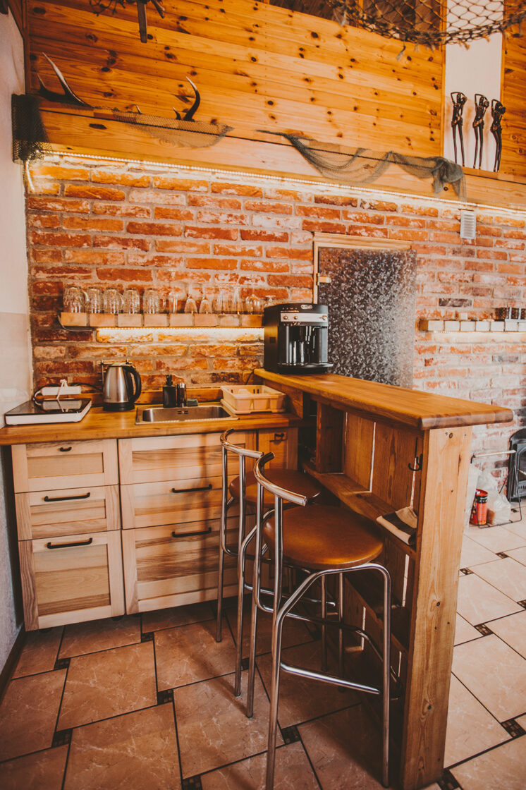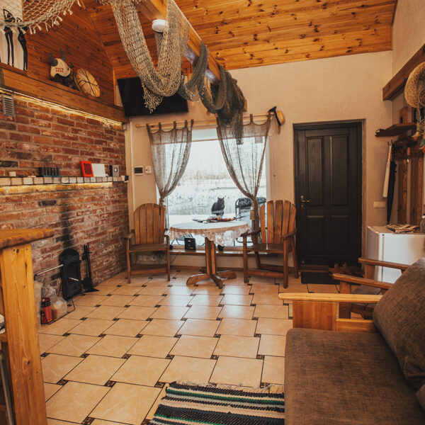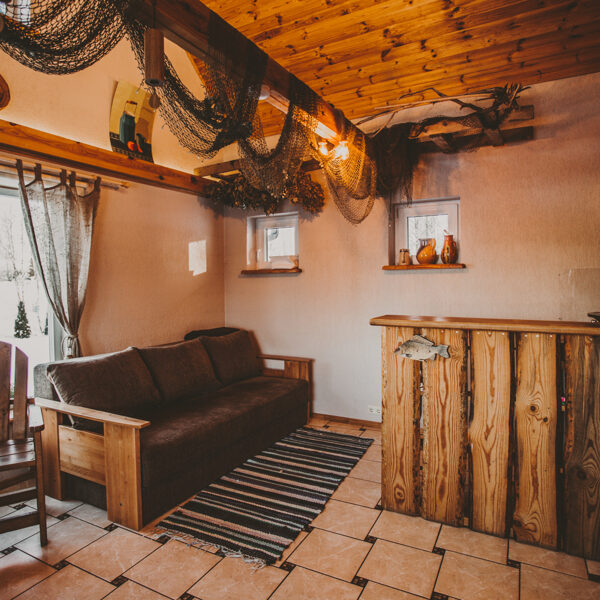 Namiņa pirmajā stāvā ir studio tipa istaba ar izlaižamu divvietīgu dīvānu un nelielu virtuves stūrīti. Virtuvē ir indukcijas plīts, ledusskapis, elektriskā tējkanna, kā arī viss nepieciešamais ēst gatavošanai- pannas, katli, trauki. Viesu labsajūtai piedāvājam kafijas automātu ar uzpildītām kafijas pupiņām.