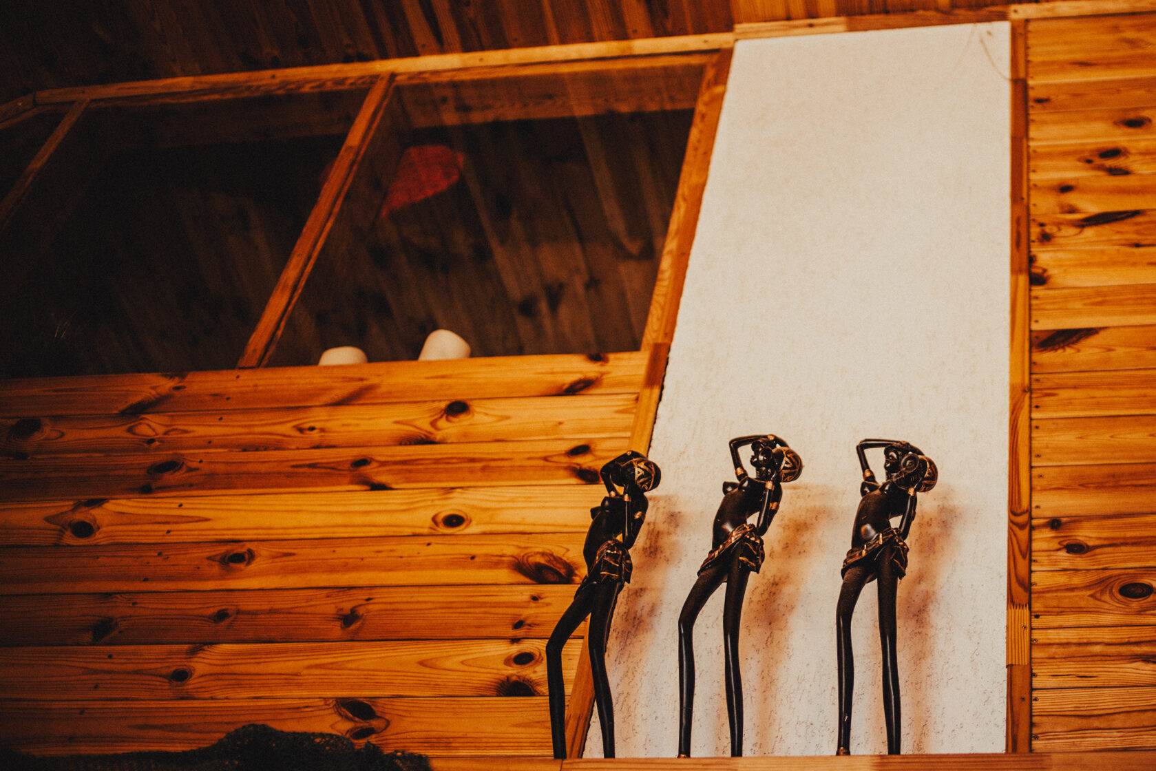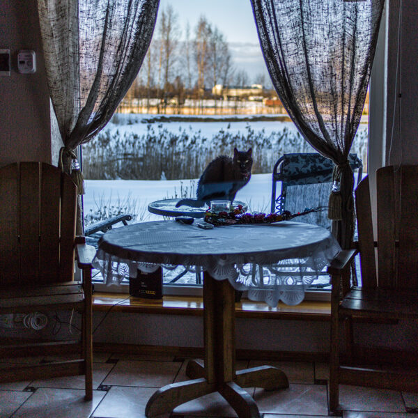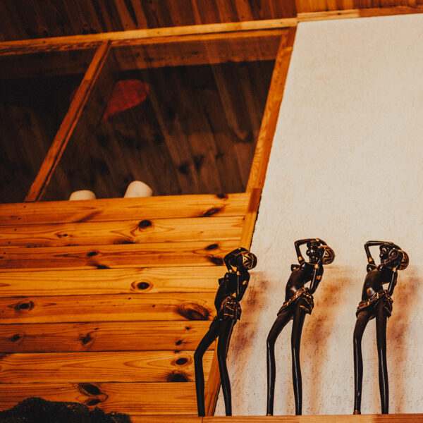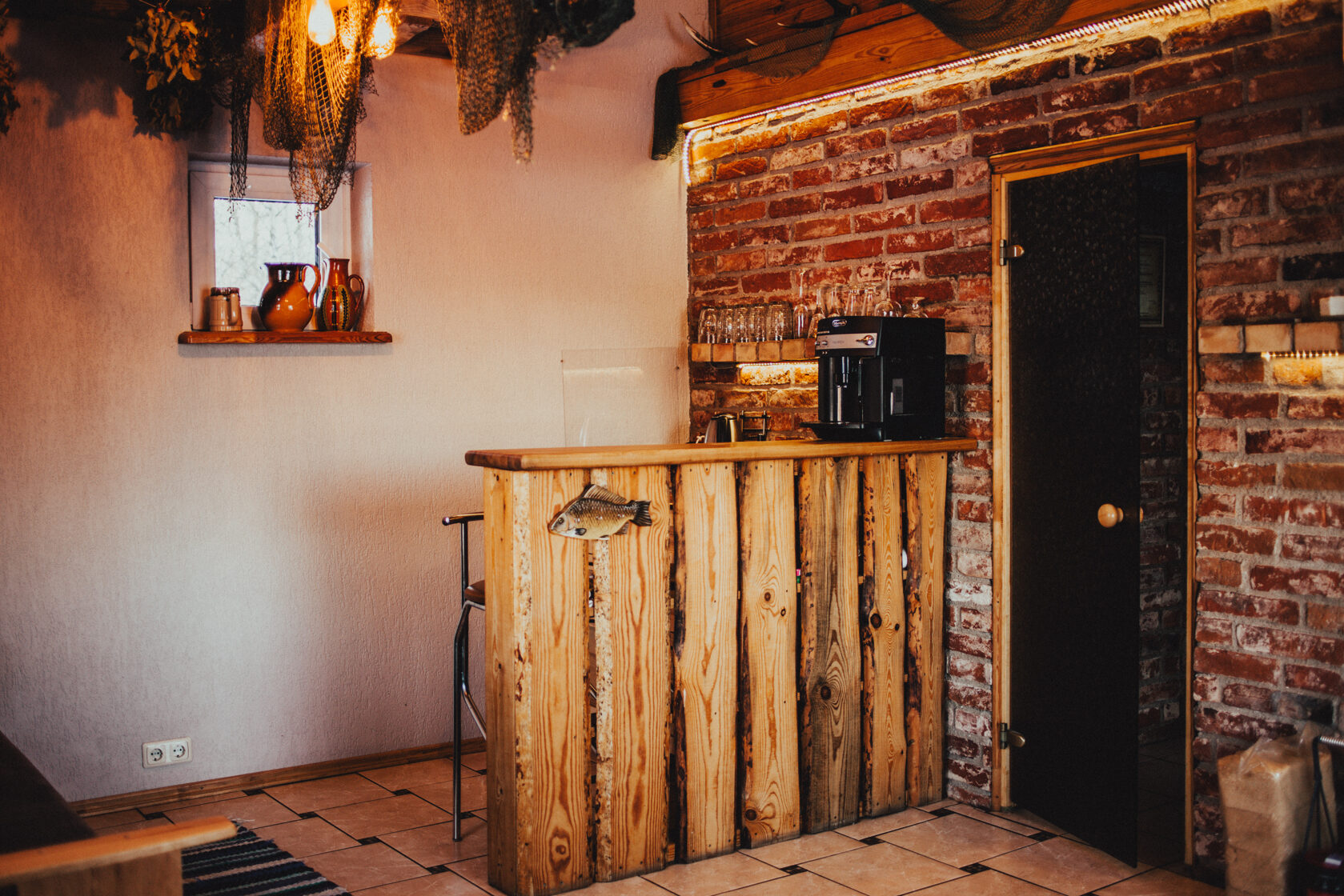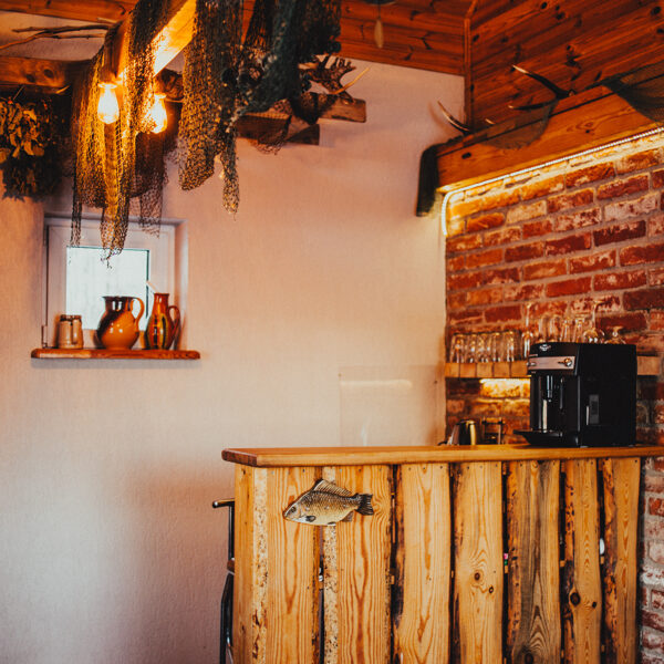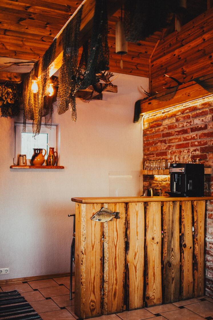 Namiņa pirmajā stāvā ir studio tipa istaba ar izlaižamu divvietīgu dīvānu un nelielu virtuves stūrīti. Virtuvē ir indukcijas plīts, ledusskapis, elektriskā tējkanna, kā arī viss nepieciešamais ēst gatavošanai- pannas, katli, trauki. Viesu labsajūtai piedāvājam kafijas automātu ar uzpildītām kafijas pupiņām.